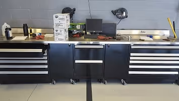 We provide modular parts shelving, tire storage, technician workstations, tool storage systems, and durable racking solutions.